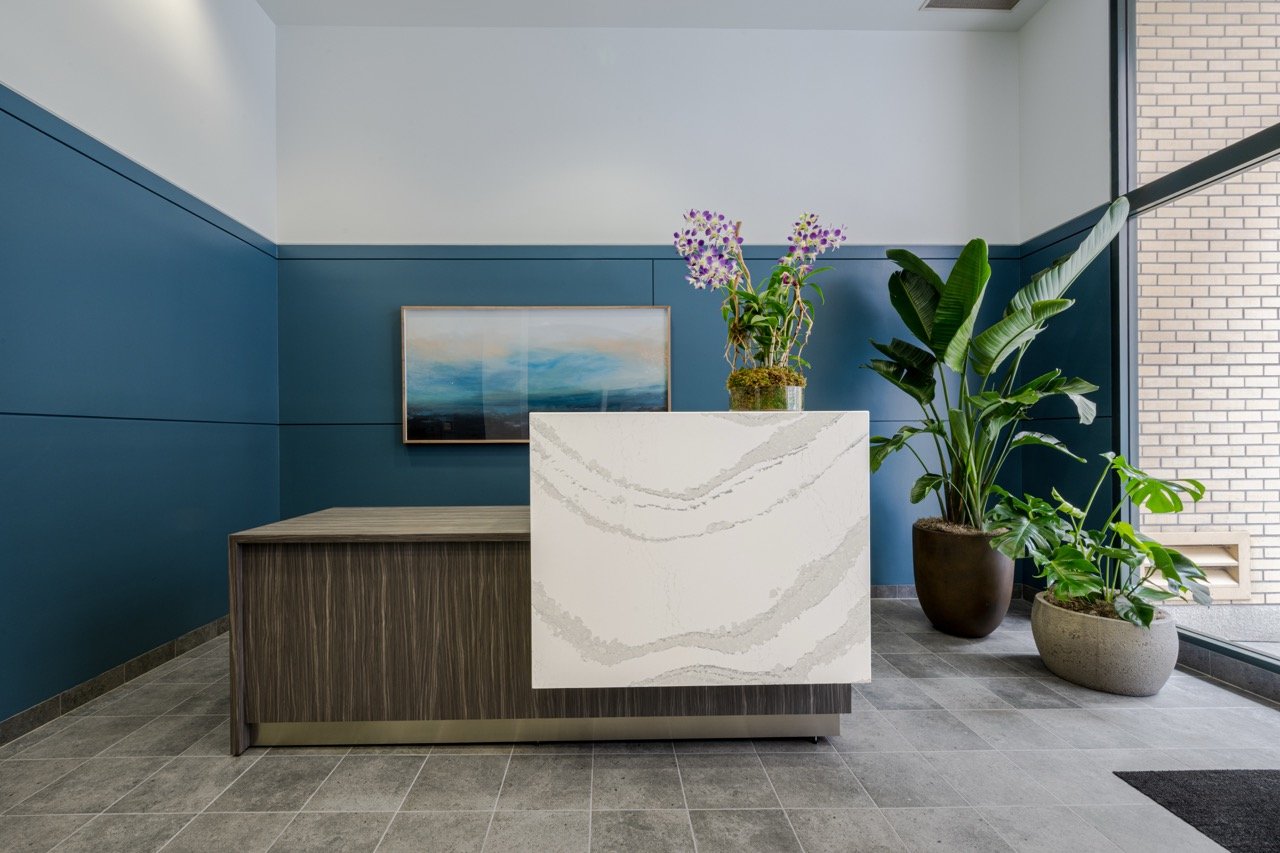 The client wanted to liven up their all-gray lobby and add seating for guests. By weaving in bold colors, artwork, and inviting furniture, the lobby has completely transformed.
