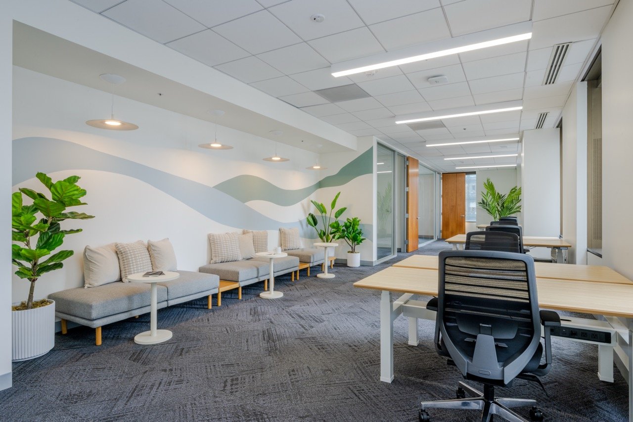 Brand hues can show up in unexpected ways, like the carpet. When the existing blue flooring didn’t resonate with prospects, we installed new carpet and curated stylish furnishings. Now the suite is turnkey and ready for its next occupant.